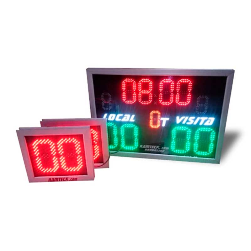 Marco de aluminio con frente de acrílico, Leds de alta luminosidad, tres renglones en cada dígito, consola inalámbrica para configurar y marcar los puntos, aviso por bocina, sellado herméticamente.
