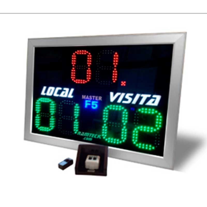Marco de aluminio con frente de acrílico, Leds de alta luminosidad, dos renglones en cada dígito, control inalámbrico para configurar y marcar los tantos, aviso por bocina.